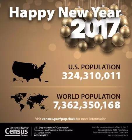 美國(guó)人口調(diào)查局給出的預(yù)測(cè)顯示,到2017年1月1日,全球人口將達(dá)到7,362,350,168人,較去年同期增長(zhǎng)1.07%。美國(guó)的人口總數(shù)為324,310,011,較去年同期增長(zhǎng)0.7%。2017年1月,全球平均每秒將有4.3人出生,1.8人死亡。(美通社,2016年12月28日華盛頓)