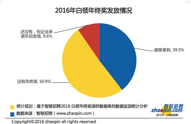 智聯(lián)招聘發(fā)布的《2016白領(lǐng)年終獎(jiǎng)?wù){(diào)查》顯示,只有39.5%的白領(lǐng)表示可以拿到年終獎(jiǎng),明顯高于2015年13.4%的比例,另外有9.6%的白領(lǐng)表示企業(yè)承諾會(huì)在年后發(fā)放年終獎(jiǎng)。調(diào)查顯示,2016年年終獎(jiǎng)的總體均值為12821元,整體水平較2015年略有上升,但仍低于2014年的13613元。金融行業(yè)和國(guó)企白領(lǐng)的年終獎(jiǎng)均值最高,為1.7萬(wàn)元。地區(qū)上,北京的年終獎(jiǎng)均值最高,為15846元,上海、深圳和杭州分列其后。(美通社,2017年1月12日北京)