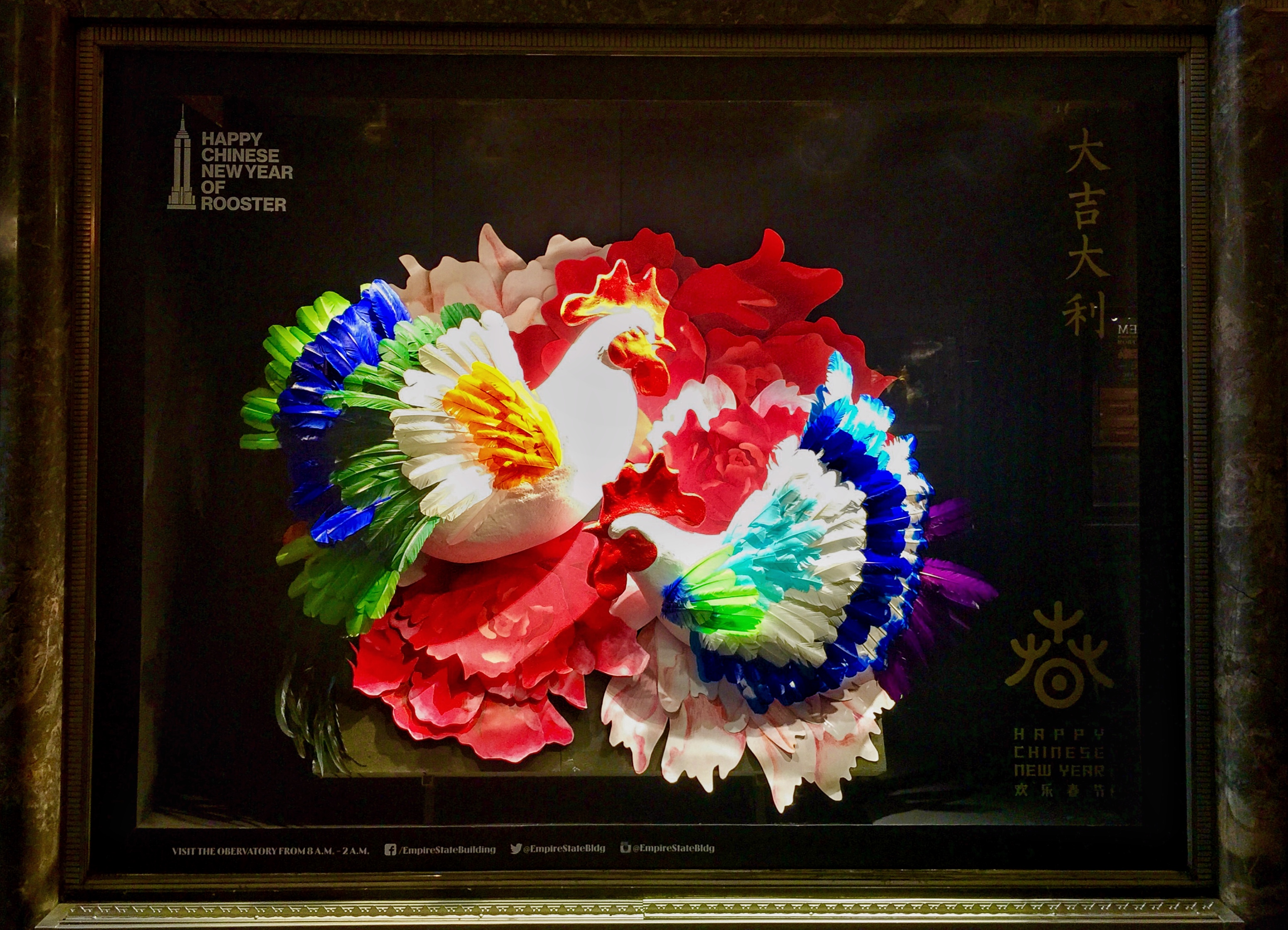 為慶祝雞年春節(jié)的到來,帝國大廈將專為中國農(nóng)歷新年亮燈并進(jìn)行新年倒數(shù),并推出一年一度的春節(jié)櫥窗展,分別以“金雞報曉”、“大吉大利”、“金雞納福”為主題,為觀眾呈獻(xiàn)融合當(dāng)代特色的立體中國年畫。2017年1月26日至27日,專為中國農(nóng)歷新年打造,由中央美術(shù)學(xué)院設(shè)計的“普天同慶”新春燈光秀將于帝國大廈舉世聞名的塔頂特別呈現(xiàn)。(美通社,2017年1月24日紐約)