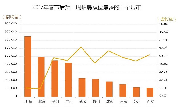 前程無憂的數(shù)據(jù)顯示,2月3日~2月9日期間,在前程無憂上的日均空缺職位超過487萬個(gè),比去年同期增加了33.1%,人員流動和新企業(yè)增多成為節(jié)后才市井噴的主要原因。和去年同期相比,二線的主要城市用人需求大幅上升,其中武漢的招聘職位達(dá)到23萬個(gè),比去年同期增加59.8%,成都的招聘需求也同比增長了55.3%。春節(jié)后計(jì)算機(jī)軟件、房地產(chǎn)開發(fā)和教育培訓(xùn)三大行業(yè)的崗位空缺快速增加,財(cái)務(wù)、行政和人力資源等支持類崗位的招聘量也出人意料地大幅增加。(美通社,2017年2月14日上海)