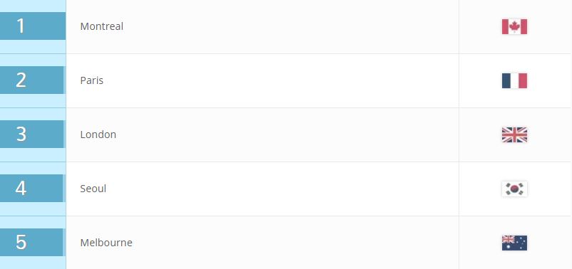 2017 QS最佳大學(xué)城市排名發(fā)布,加拿大蒙特利爾從去年的第七位升至第一,終結(jié)巴黎的五連冠。巴黎掉至第二位,主要是因為在支付能力和向往度兩方面得分下降。倫敦由去年的第五名上升至第三,去年第十名的首爾升至第四,而墨爾本則由去年的第二跌至第五。中國最好成績是排在第11位的香港,上海和北京分列第25和30名。(美通社,2017年2月15日倫敦)