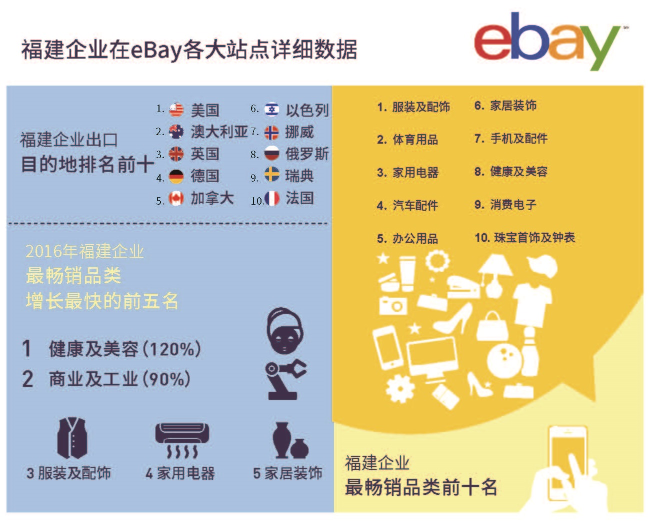 eBay與福建省商務(wù)廳、福州市人民政府共同簽署了戰(zhàn)略合作協(xié)議。三方將攜手合作實現(xiàn)優(yōu)勢資源整合,重點推動福建省跨境電商出口產(chǎn)業(yè)在政策扶植、人才培養(yǎng)、產(chǎn)業(yè)優(yōu)化和物流基建等領(lǐng)域的創(chuàng)新發(fā)展。據(jù)eBay內(nèi)部數(shù)據(jù)顯示, 在2016年,福建跨境電商零售出口企業(yè)通過eBay平臺將產(chǎn)品出口至200多個國家和地區(qū),其中,排名前三的出口目的地市場分別為美國、澳大利亞和英國。在暢銷品類方面,服飾配件、體育用品、家用電器、汽配和辦公用品分別居銷售榜前五位。(美通社,2017年4月7日福州)
