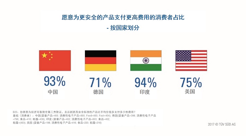 知名認(rèn)證機(jī)構(gòu)TUV南德意志集團(tuán)進(jìn)行了一項(xiàng)全球性的獨(dú)立研究,選取了中國(guó)、德國(guó)、印度和美國(guó)這四個(gè)國(guó)家的數(shù)個(gè)一線城市作為樣本,寫成《TUV南德意志集團(tuán)消費(fèi)品安全報(bào)告》。報(bào)告顯示,中國(guó)消費(fèi)者對(duì)產(chǎn)品安全的關(guān)注程度不斷提升。在被調(diào)查的中國(guó)消費(fèi)者中有63%的人表示,產(chǎn)品安全現(xiàn)在對(duì)他們來(lái)說(shuō)非常重要,而且在2007年,這一比例僅為53%。中國(guó)企業(yè)對(duì)產(chǎn)品的安全意識(shí)也在四個(gè)受訪國(guó)中排名第一,從2012年的72%上升至年93%,其次分別是德國(guó)(201680%),印度(62%)及美國(guó)(62%)。在中國(guó),愿意為產(chǎn)品支付更高價(jià)格的消費(fèi)者的比例達(dá)到了93%,遠(yuǎn)超美國(guó)的75%和德國(guó)的71%。嬰童產(chǎn)品為消費(fèi)者愿意“花高價(jià),買安全”的產(chǎn)品。(美通社,2017年5月8日上海)