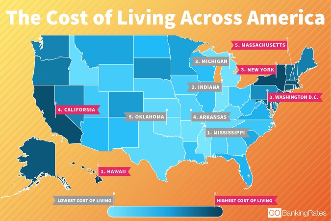 美國(guó)財(cái)經(jīng)網(wǎng)站GOBankingRates的一項(xiàng)調(diào)查顯示,美國(guó)生活成本最高的五個(gè)州分別是夏威夷州、哥倫比亞特區(qū)、紐約州、加州以及馬薩諸塞州,而生活成本最低的五個(gè)州則分別是密西西比州、印第安納州、密歇根州、阿肯薩斯州以及俄克拉荷馬州。這項(xiàng)排名是綜合比較各州房?jī)r(jià)、日用品、水電氣、交通、健康醫(yī)療以及各種雜項(xiàng)開(kāi)支后得出的。值得一提的是,房?jī)r(jià)方面,華盛頓特區(qū)要比全美平均房?jī)r(jià)高出134%,成為美國(guó)房?jī)r(jià)最貴的地區(qū),加州緊隨其后,高出全國(guó)平均水平92.7%。(美通社,2017年5月11日洛杉磯)