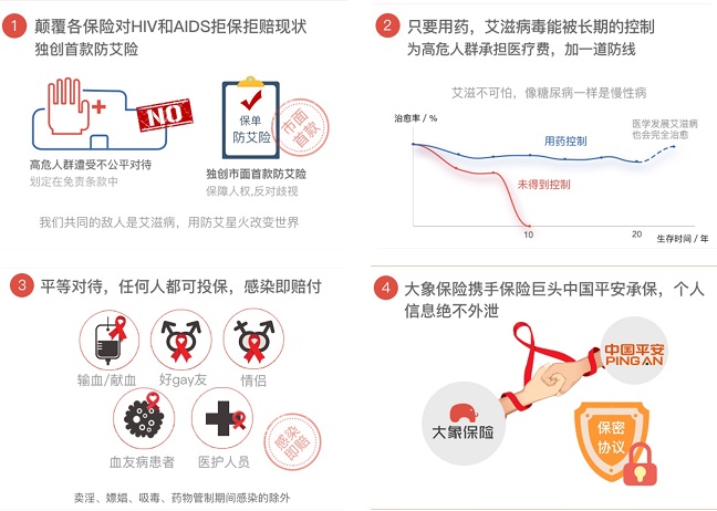 在第三十四個(gè)艾滋病燭光紀(jì)念日來(lái)臨之際,大象保險(xiǎn)攜手中國(guó)平安財(cái)產(chǎn)保險(xiǎn)股份有限公司推出了一款名為“防艾險(xiǎn)”的新險(xiǎn)種。大象保險(xiǎn)相關(guān)負(fù)責(zé)人介紹:“‘防艾險(xiǎn)’是國(guó)內(nèi)保險(xiǎn)業(yè)第一款也是目前唯一一款針對(duì)易感染人群的艾滋病感染專項(xiàng)保障險(xiǎn)種。”“防艾險(xiǎn)”顛覆了各保險(xiǎn)公司對(duì)HIV和AIDS拒保拒賠的現(xiàn)狀。承保后,采用確診即賠付的方式。艾滋病是一種危害性極大的傳染病,潛伏時(shí)間長(zhǎng)、治療方法復(fù)雜、治療周期也很長(zhǎng)。雖然國(guó)家的醫(yī)保政策使部分患者解決了一些費(fèi)用問(wèn)題,但是由于報(bào)銷(xiāo)比例和用藥限制等因素,還是給很多家庭造成了極大的負(fù)擔(dān)。(美通社,2017年5月17日北京)