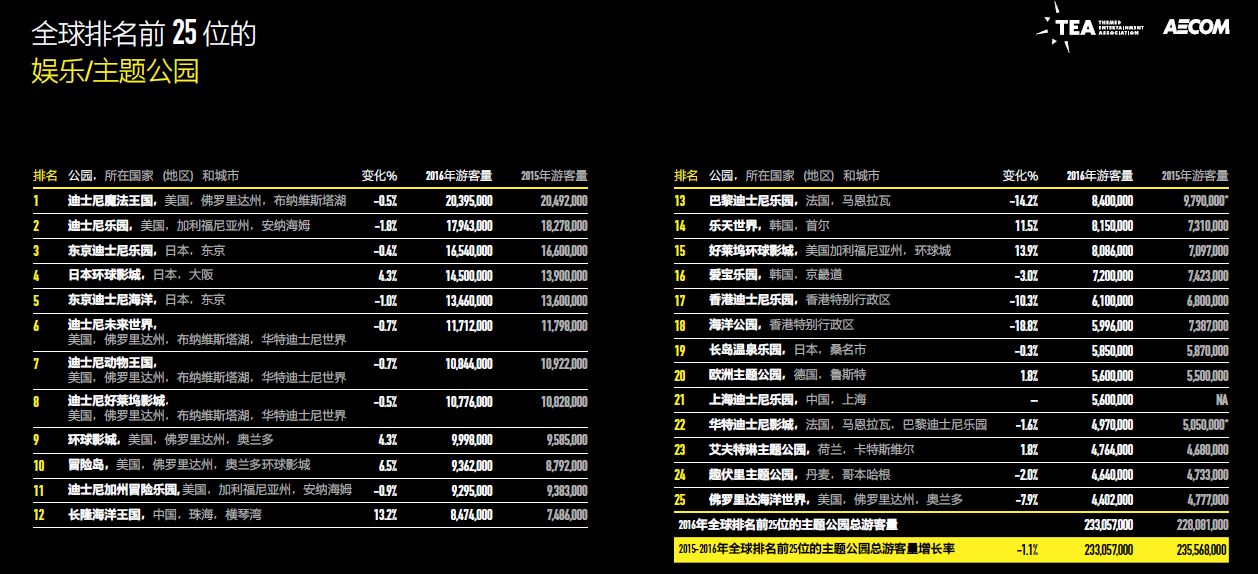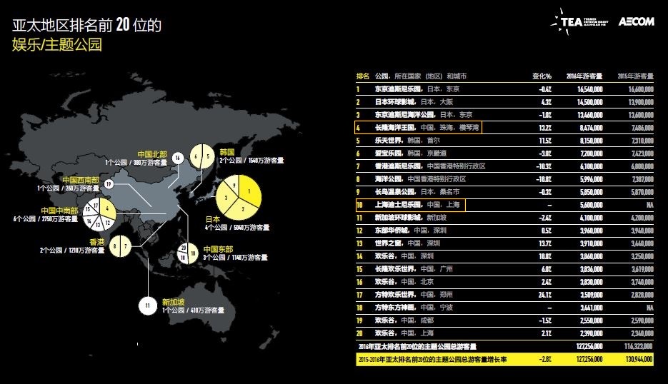 由主題娛樂協(xié)會(Themed Entertainment Association,簡稱“TEA”)與AECOM聯(lián)合推出的《2016主題公園報告和博物館報告》正式出版。報告顯示,盡管去年世界排名前25名的主題公園游客總量略降1.1%,但排名最前的10大主題公園運(yùn)營商旗下的公園游客量卻增長4.3%,從4.2億人次增長至4.38億人次。