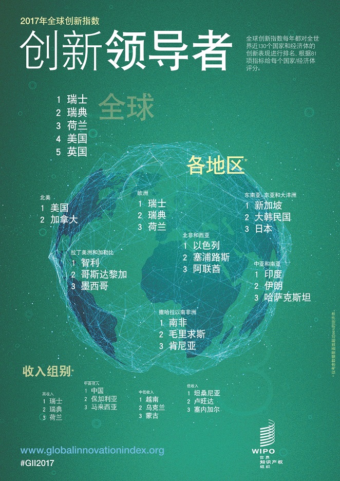 由康奈爾大學(xué)、英士國際商學(xué)院(INSEAD)和世界知識產(chǎn)權(quán)組織(產(chǎn)權(quán)組織)合編的2017年全球創(chuàng)新指數(shù)顯示,瑞士、瑞典、荷蘭、美國和英國是世界上最具創(chuàng)新力的國家,而包括印度、肯尼亞和越南在內(nèi)的若干國家的表現(xiàn)則優(yōu)于發(fā)展水平相當?shù)耐瑑?/strong>。2017年,瑞士連續(xù)第七年位列榜首,除排名第22位的中國之外,前25名中的24個都是高收入經(jīng)濟體。2016年,中國首次成為進入前25名的中等收入經(jīng)濟體。亞太地區(qū),排在中國之前的經(jīng)濟體分別是新加坡(全球第7),韓國(全球第11),日本(全球第14),和香港(全球第16)。(美通社,2017年6月15日日內(nèi)瓦)