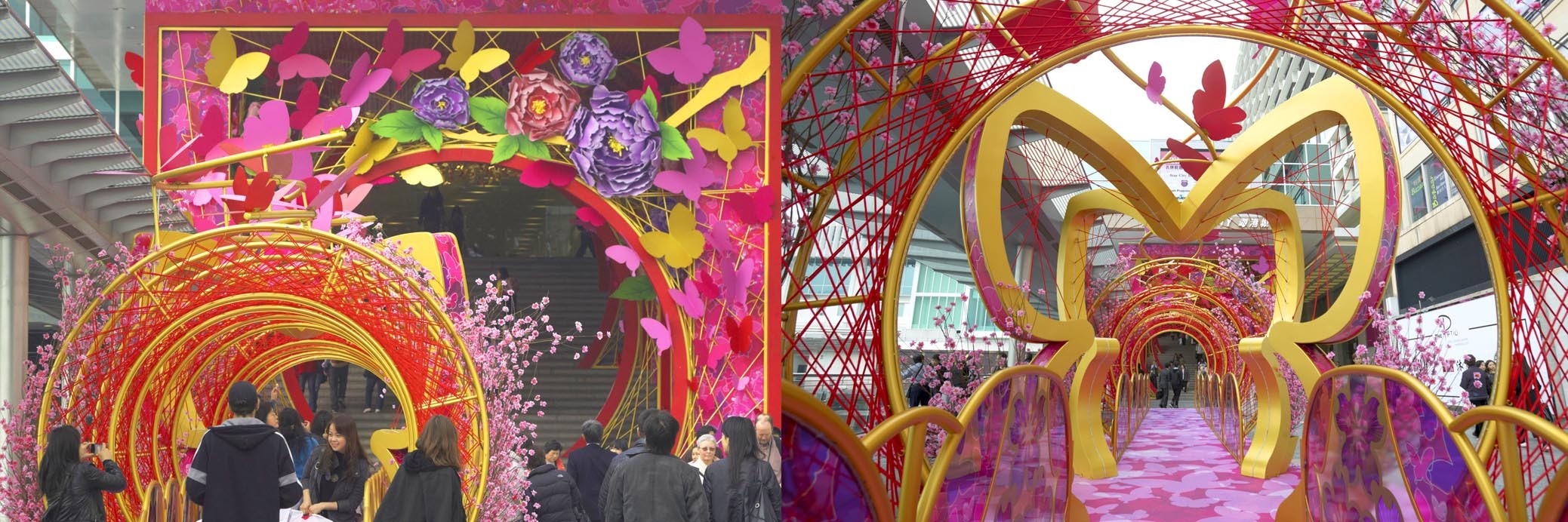 海港城海運(yùn)大廈正門設(shè)置以金色及桃紅色為主色,桃紅色的柱身及長廊布滿了三千多只金色喜蝶,在巨型牡丹花叢襯托下翩翩起舞。而正門天花更掛上了3 組由許多只蝴蝶組成的12尺闊巨型喜蝶,俏麗的喜蝶在花叢中欣然起舞,春意盎然般躍現(xiàn)活潑朝氣,寓意“花開富貴”、“喜蝶迎春”,跟大家一起迎接新春佳節(jié)。