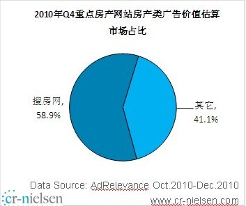 北京2011年1月28日電 /美通社亞洲/ -- 近期,全球權(quán)威機(jī)構(gòu)CR-Nielsen(尼爾森)發(fā)布《2010年第四季度中國(guó)房地產(chǎn)網(wǎng)絡(luò)展示廣告市場(chǎng)研究項(xiàng)目報(bào)告》(以下簡(jiǎn)稱報(bào)告)顯示,2010四季度年中國(guó)房地產(chǎn)網(wǎng)絡(luò)展示廣告市場(chǎng)整體發(fā)展良好,廣告推廣項(xiàng)目、廣告主數(shù)、創(chuàng)意數(shù)環(huán)比第三季度均有穩(wěn)健增長(zhǎng)。搜房網(wǎng)在這三個(gè)核心考核指標(biāo)中以近六成的比例高居榜首,其中在房產(chǎn)類廣告主指標(biāo)上優(yōu)勢(shì)顯著,行業(yè)占比高達(dá)75.9%。