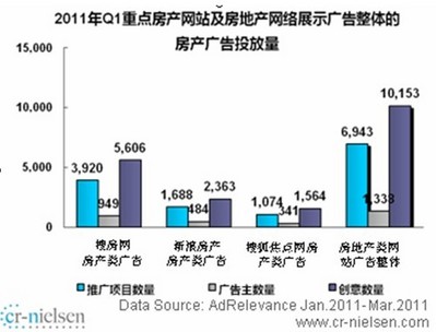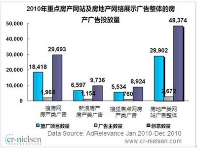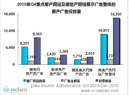 整體來看,房產(chǎn)廣告推廣項(xiàng)目數(shù)、廣告主總量、廣告創(chuàng)意數(shù)與去年同期相比都有大幅增長(zhǎng),其中房產(chǎn)廣告推廣項(xiàng)目數(shù)與去年同期相比增長(zhǎng)113.4%,較為迅速。同時(shí)報(bào)告分析指出,房地產(chǎn)網(wǎng)絡(luò)展示廣告投放TOP3網(wǎng)站分別為搜房網(wǎng)、新浪房產(chǎn)、搜狐焦點(diǎn)網(wǎng)。報(bào)告顯示,2010年第四季度中國(guó)互聯(lián)網(wǎng)房地產(chǎn)行業(yè)展示類廣告推廣項(xiàng)目總量為10811個(gè),其中搜房網(wǎng)是第二名2.5倍、第三名的3.5倍;2010年第四季度中國(guó)互聯(lián)網(wǎng)房地產(chǎn)行業(yè)展示類廣告廣告主總量為1734,搜房網(wǎng)以75.9%的份額大幅領(lǐng)先;2010年第四季度中國(guó)互聯(lián)網(wǎng)房地產(chǎn)行業(yè)展示類廣告創(chuàng)意總量為16597,搜房網(wǎng)以9563領(lǐng)先第二名和第三名3-4倍的優(yōu)勢(shì)雄踞榜首。