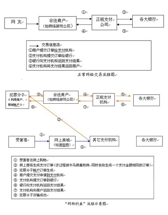 示意圖如上(如圖所示,“正規(guī)支付機(jī)構(gòu)”兩端的流程都是正常流程,無(wú)法分辨是騙子還是受害者;但“網(wǎng)上商城”、“合法商戶(hù)”有責(zé)任追索到騙子):