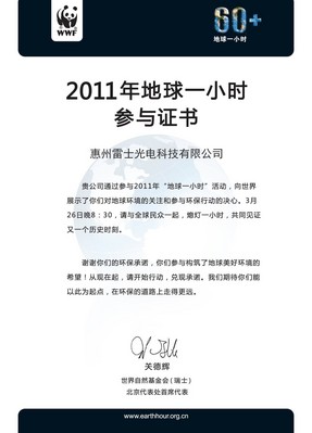 中國惠州2011年3月25日電 /美通社亞洲/ -- 當前,關(guān)注全球氣候變化,重視人類居住環(huán)境保護,提倡節(jié)能環(huán)保,推廣低碳減排,這已是越來越成為人們的廣泛共識。為響應WWF(世界自然基金會)發(fā)起的倡議,3月26日20:30—21:30,屆時來自全球各國家的組織、團體和個人,超過十多億人將共同參與進來“地球熄燈一小時”活動。今年的地球一小時,以“熄燈一小時+你的環(huán)保改變”為核心主題,號召參與者除了在3月26日當天20:30-21:30熄燈一小時之外,為環(huán)保做出一個力所能及的行動改變。