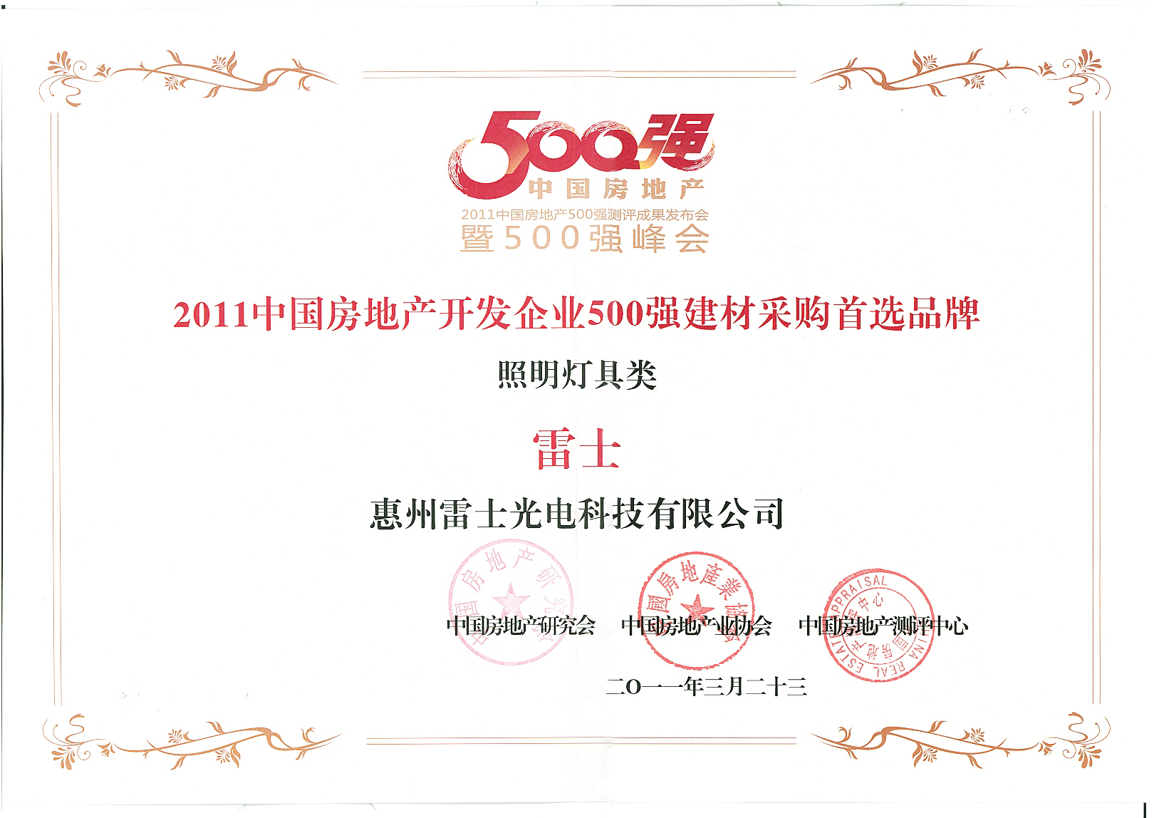 惠州2011年3月29日電 /美通社亞洲/ -- 3月23日,2011中國房地產(chǎn)500強測評成果發(fā)布會暨500強峰會在北京舉行,中國房地產(chǎn)研究會、中國房地產(chǎn)業(yè)協(xié)會與中國房地產(chǎn)測評中心聯(lián)合發(fā)布了《2011中國房地產(chǎn)開發(fā)企業(yè)500強測評研究報告》、《2011中國房地產(chǎn)開發(fā)企業(yè)500強建材采購首選品牌測評研究報告》。根據(jù)該測評研究報告顯示,中國照明品牌行業(yè)巨頭 -- 雷士照明延續(xù)了去年的強勁勢頭,入選2011年中國房地產(chǎn)開發(fā)企業(yè)500強建材采購首選品牌(照明燈具類),以25%的品牌首選率再次超過飛利浦等國內(nèi)外品牌,榮登首選品牌榜首。