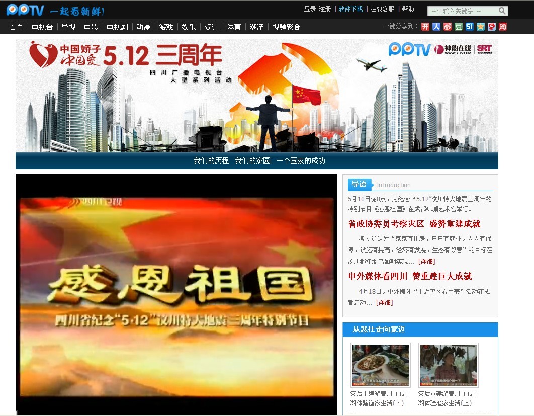 2008年5月12日,8級(jí)強(qiáng)震曾給汶川帶來(lái)了巨大的災(zāi)難。今年5月12日當(dāng)天,PPTV 網(wǎng)絡(luò)電視12小時(shí)同步直播“5.12特別節(jié)目:從悲壯走向豪邁”,該節(jié)目以全新的視角、多樣的播報(bào)方式,重現(xiàn)波瀾壯闊的抗震救災(zāi)現(xiàn)場(chǎng)和恢復(fù)重建歷程,直播報(bào)道重點(diǎn)反映了災(zāi)區(qū)這三年的變化,以突出從悲壯走向豪邁這一主題。當(dāng)天12小時(shí)的直播當(dāng)中,采用演播室播報(bào)、訪(fǎng)談、SNG 直播點(diǎn)、成片、短信微博互動(dòng)等多種形式,見(jiàn)證災(zāi)區(qū)三年的發(fā)展與變化。早在5月10日晚8點(diǎn),PPTV 網(wǎng)絡(luò)電視就通過(guò)自身資訊頻道同步直播了“感恩祖國(guó) -- 四川省紀(jì)念5.12汶川特大地震三周年”的特別節(jié)目。
