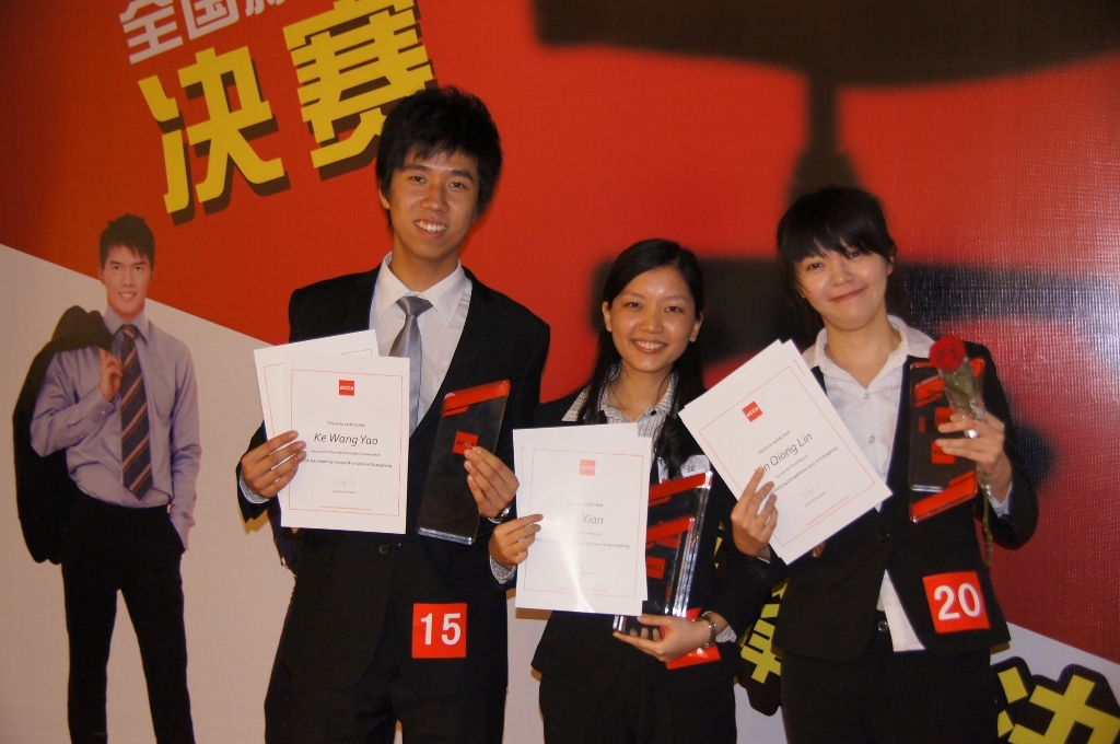 胡弦同學是暨南大學國際學院的大三學生,在班級中成績排名在前2%。她出眾英語能力深受評委們贊賞,此前還曾獲得廣東省大學生英語演講比賽第一名和全國 CCTV 英語演講比賽優(yōu)勝獎。決賽之前,她就曾經(jīng)在4月16日 ACCA 就業(yè)力大比拼前20選手“職業(yè)訓練營”的人際交往練習環(huán)節(jié)中獲得選手們共同票選的第一名。當時選手們的職業(yè)訓導導師程煜麟先生總結(jié)了選手們的意見,認為胡弦獲勝的原因在于她在與人交談時始終表現(xiàn)出淡定、大方、誠懇和自信,讓與之交談的人感覺如沐春風。亞軍柯汪堯同學也是一名大三學生,現(xiàn)就讀于廣東外語外貿(mào)大學國際商務(wù)英語學院國際貿(mào)易專業(yè),他在密鑼緊鼓準備比賽的同時還在廣交會實習,毅力過人的他克服了時間的困難,帶領(lǐng)比賽團隊出色地完成項目,最終以成熟自信的表現(xiàn)獲得評委一致好評。與亞軍來自同一學院的辛瓊璘同學是國際商務(wù)(全英班)的學生,她親切大方的形象、良好的團隊合作精神和敏捷的才思令評委們留下深刻印象。