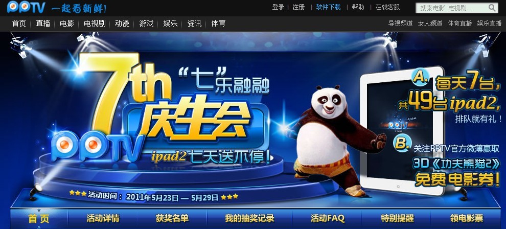 上海2011年5月20日電 /美通社亞洲/ -- PPTV 網(wǎng)絡(luò)電視正式步入7年發(fā)展新歷程,為感謝眾多忠實擁護者7年來的陪伴,大規(guī)模開展系列慶生活動。5月23日 - 29日,一場以“PPTV‘七樂融融’慶生會,7天 iPad2 送不?!睘橹黝}的線上排隊?wèi)c生抽獎活動,在國內(nèi)火熱展開。通過每天7臺,連續(xù)7天送出49臺新款蘋果 iPad2 為用戶禮物以及2000張(僅限北上廣三地) 3D 《功夫熊貓2》電影票,回饋一直以來支持 PPTV 網(wǎng)絡(luò)電視的用戶,與億萬網(wǎng)民一同分享國內(nèi)首屈一指的網(wǎng)絡(luò)電視媒體7年成長喜悅。(活動官網(wǎng):http://7.pptv.com)