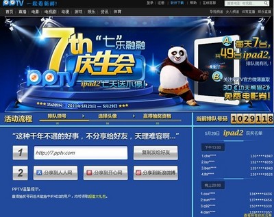 官網(wǎng)方面,用戶只要在5月23日 - 29日7天內(nèi)登錄PPTV網(wǎng)絡(luò)電視官網(wǎng),進入活動頁面點擊參與活動加入排隊流程便會得到一個排隊號,號碼每逢7的倍數(shù)即有機會參與抽獎。7天49臺 iPad2 火熱送出。微博方面,5月23日 - 27日期間,登錄官方微博,關(guān)注 PPTV 網(wǎng)絡(luò)電視分享活動信息或邀請7位好友前來參與本次活動,即有機會免費贏取 3D 版《功夫熊貓2》電影券以及7天免費的 PPTV 網(wǎng)絡(luò)電視 VIP 服務(wù)。