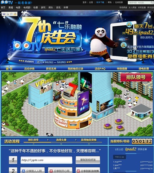 截止到29日活動結(jié)束還有6天時間,用戶凡是登錄 PPTV 網(wǎng)絡電視官網(wǎng),進入活動頁面點擊參與活動加入排隊流程,便會得到一個排隊號,號碼每逢7的倍數(shù)即有機會參與抽獎。為了讓后續(xù)的活動中獎幾率保持如活動開始時一樣,當天的抽獎號碼如未中獎,當天獎池內(nèi)便會清空一次,以確?;顒拥诙炀W(wǎng)友均有機會獲得 PPTV 送出的7臺 iPad 大獎和千張電影券,也就是說網(wǎng)友們可以連續(xù)7日排隊拿大獎,iPad2 送不停。