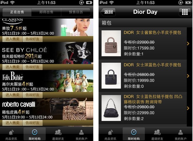 清新明快的版面設(shè)計也深受用戶的好評。此客戶端的另一亮點(diǎn)在于它的短信與郵件邀請好友功能,用戶可與朋友分享愉悅的購物心情。尚品網(wǎng) iPhone 客戶端擺脫了一些 APP 軟件的固定設(shè)計模式,大膽創(chuàng)新,其中“我的賬戶”功能可及時查詢訂單信息,激活和使用尚品為用戶提供的代金券,用戶可以在留言板與客服咨詢商品信息,查詢好友的邀請記錄。軟件還首創(chuàng)預(yù)售日歷,便于隨時查閱未來七天限時的活動信息,更有貼心之舉在于會員還可專享尚品為 iPhone 用戶提供的真情優(yōu)惠折扣。