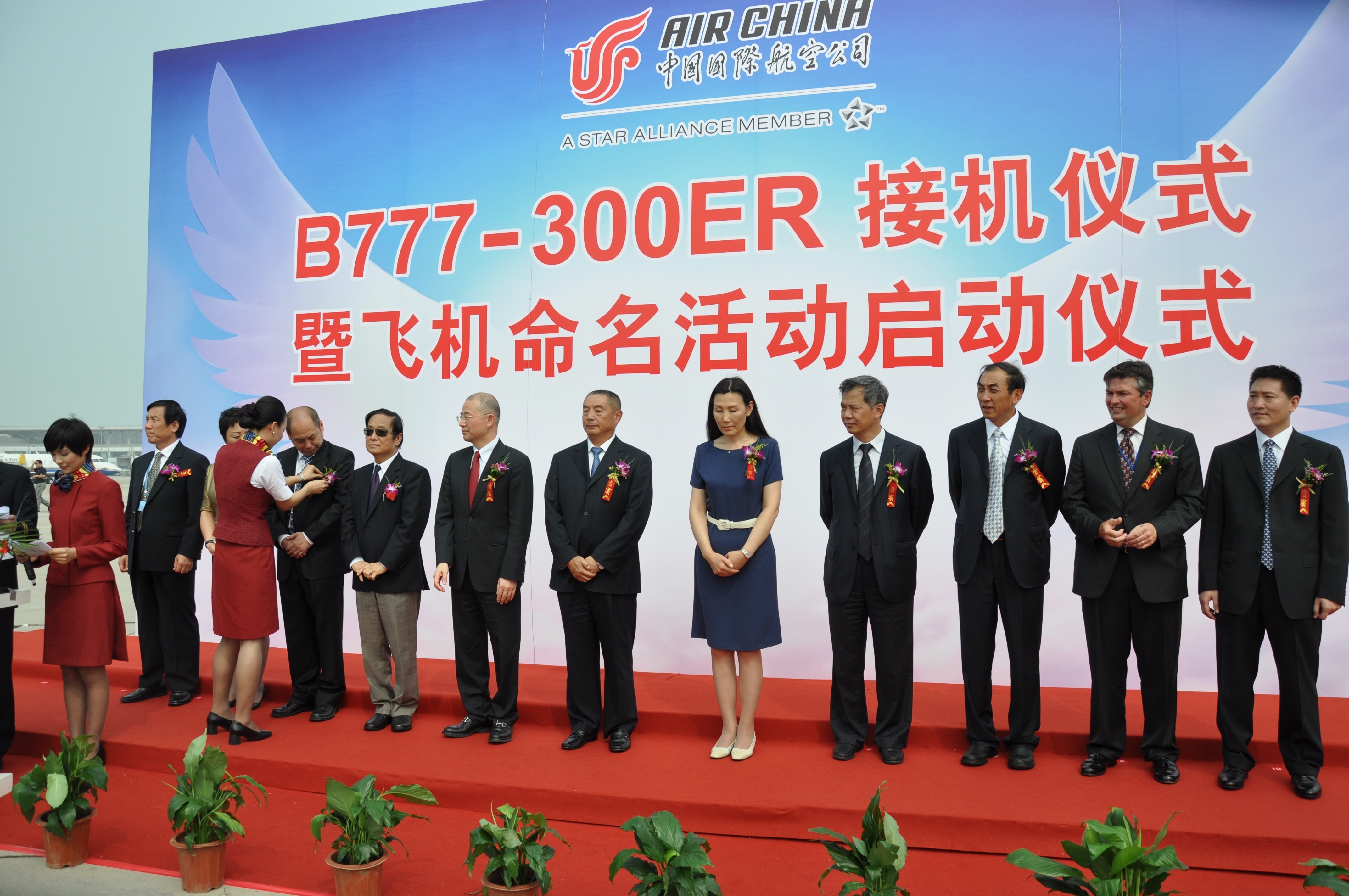 7月21日下午3時,飛機抵達的同時,國航在北京首都機場停機坪舉行了簡單而熱烈的接機儀式。中航集團總經(jīng)理、國航董事長孔棟,中航集團黨組書記、國航副董事長王銀香,國航黨委書記樊澄,國航副總裁賀利、王明遠,國航黨委副書記馮潤娥,國航總經(jīng)濟師許建強等出席儀式。首都機場股份公司總經(jīng)理張光輝等駐場單位代表和波音公司代表到場祝賀。藝術(shù)大師、國航標(biāo)志的主要設(shè)計者韓美林與首航機長、乘務(wù)長共同為飛機命名活動揭匾。國航常旅客代表還在儀式上暢談了全程體驗的美好感受。