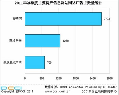 DCCI Admonitor 2011年第二季度網(wǎng)絡(luò)廣告投放監(jiān)測數(shù)據(jù)顯示,搜房網(wǎng)、新浪樂居和焦點房地產(chǎn)網(wǎng)是廣告主集中投放的專業(yè)房產(chǎn)網(wǎng)站,搜房網(wǎng)以3176家廣告主的數(shù)量繼續(xù)占據(jù)首位,領(lǐng)先于其他房產(chǎn)網(wǎng)站廣告主的數(shù)量,搜房網(wǎng)的廣告主數(shù)量在整個房產(chǎn)網(wǎng)站廣告主數(shù)量的占比超過50%。