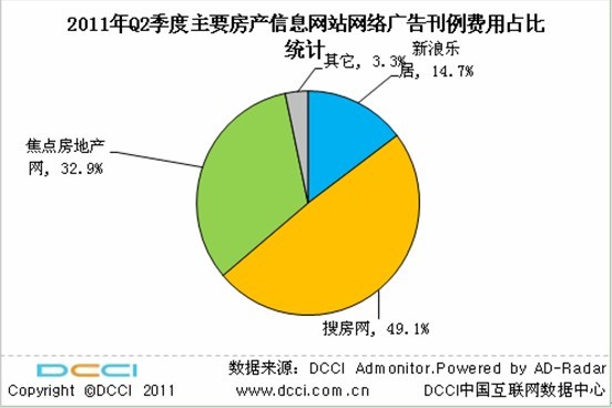 DCCI Admonitor 2011年第二季度網(wǎng)絡(luò)廣告投放監(jiān)測數(shù)據(jù)顯示,2011年第二季度專業(yè)房產(chǎn)信息網(wǎng)站的刊例費(fèi)大都出現(xiàn)了上漲,其中搜房網(wǎng)的刊例費(fèi)位居第一,其營收規(guī)模突破億元大關(guān),達(dá)到1.23億元,焦點房地產(chǎn)網(wǎng)和新浪樂居位列二、三位;搜房網(wǎng)在房產(chǎn)信息服務(wù)網(wǎng)站網(wǎng)絡(luò)廣告總刊例費(fèi)用比例接近50%,遙遙領(lǐng)先其它網(wǎng)站。2011年第二季度房產(chǎn)信息網(wǎng)站的廣告投放規(guī)模出現(xiàn)了明顯的回暖與增長。