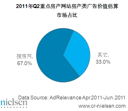 2011年Q2房產(chǎn)類網(wǎng)絡(luò)展示廣告價值估算整體達(dá)到3.01億元,其中搜房網(wǎng)房產(chǎn)類廣告價值估算高達(dá)2.02億元,占行業(yè)整體的67.0%,遠(yuǎn)超其他競爭對手。