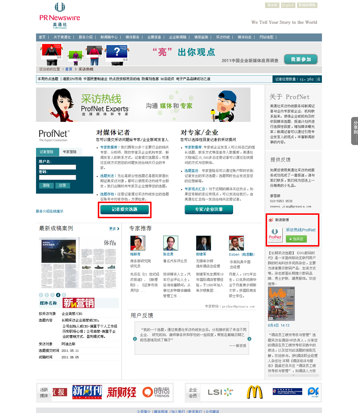 美通社中文采訪熱線是國內(nèi)首個(gè)也是唯一實(shí)時(shí)收集媒體采訪選題的媒體情報(bào)服務(wù),改版后的采訪熱線平臺(tái)更加簡潔易用,媒體選題提交與專家在線注冊(cè)各項(xiàng)功能清晰劃分,并集成了新浪微博@采訪熱線ProfNet 內(nèi)容實(shí)時(shí)展示、國內(nèi)主流社交媒體平臺(tái)一鍵分享功能,記者用戶可以通過“快速提交選題”按鈕,無需注冊(cè)輕松提交發(fā)送相關(guān)選題提問,并可通過新浪微博@采訪熱線 ProfNet 私信功能快速提問,通過微博與行業(yè)專家、分析師、企業(yè)新聞發(fā)言人保持實(shí)時(shí)互動(dòng)。