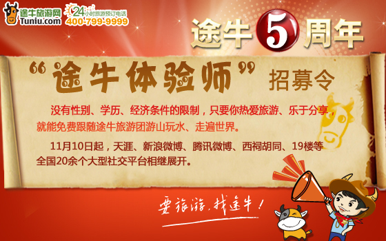 北京和上海2011年11月21日電 /美通社亞洲/ -- 途牛旅游網(wǎng)推出5周年系列活動–“途牛體驗師”PK 賽,看到招募令中“游遍全世界的夢”如此美好的字眼,環(huán)游世界的夢想是否也曾在腦海中浮現(xiàn)?是否也向往碧海白沙的悠閑與愜意,向往祖國山川的壯闊與秀麗?“途牛體驗師”,讓夢想輕松實現(xiàn)!