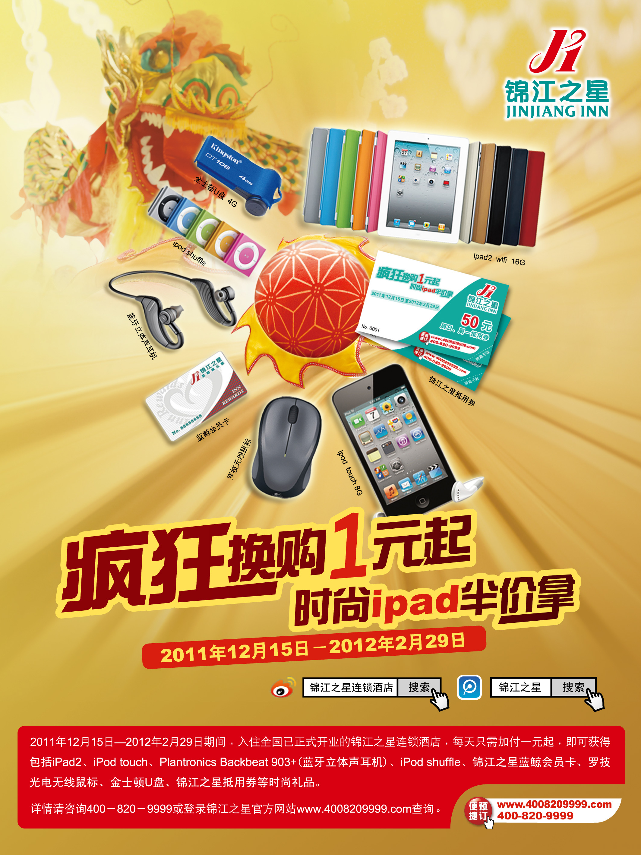 上海2011年12月6日電 /美通社亞洲/ -- 在連續(xù)兩年推出“千萬獎品別錯過”活動引爆春節(jié)市場后,錦江之星將于2012年春節(jié)期間再掀優(yōu)惠風(fēng)暴。從2011年12月15日起,至2012年2月29日,錦江之星將推出“瘋狂換購1元起,時(shí)尚iPad半價(jià)拿”主題優(yōu)惠活動,錦江之星體驗(yàn)券、藍(lán)鯨會員卡和眾多時(shí)尚數(shù)碼獎品,只要1元起,即可超值換購。