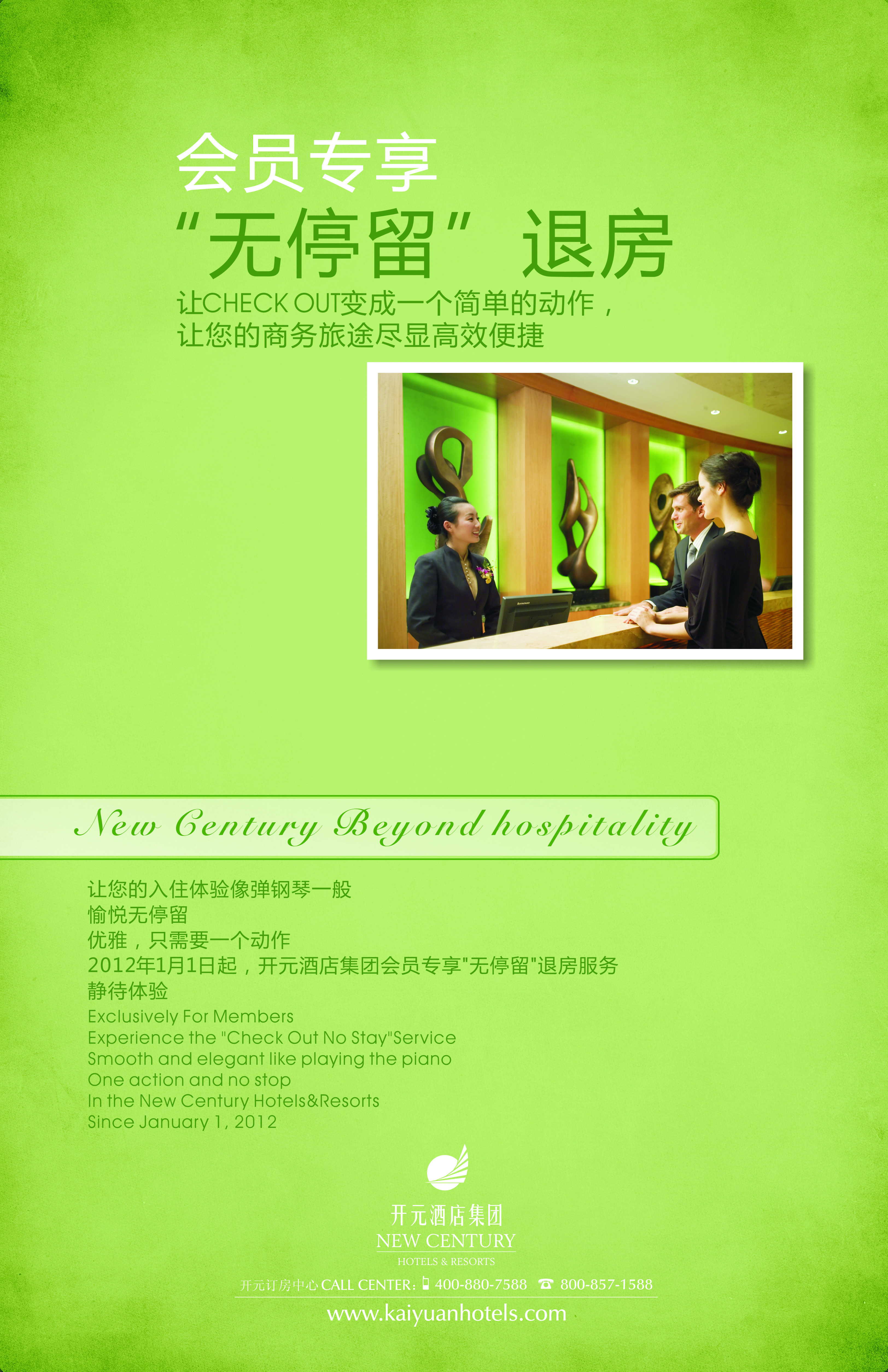蕭山市2011年12月23日電 /美通社亞洲/ -- 從2012年1月1日起,一項(xiàng)全新的“無(wú)停留退房”計(jì)劃將在開(kāi)元酒店集團(tuán)所有成員酒店進(jìn)行開(kāi)展。只要是開(kāi)元商祺會(huì)會(huì)員,一經(jīng)入住開(kāi)元酒店,即可享受“無(wú)停留退房”服務(wù)。