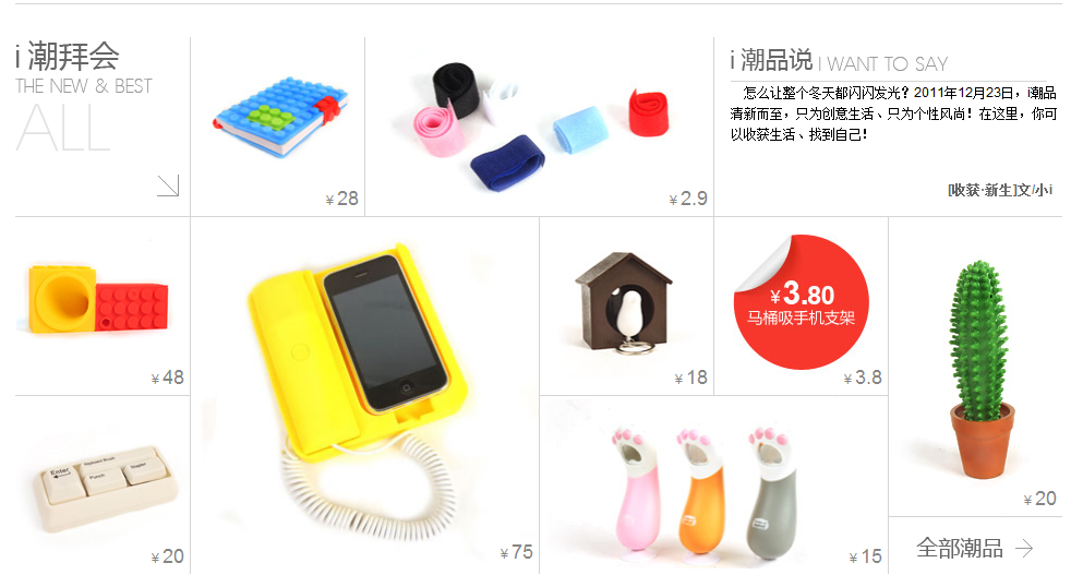 北京2011年12月26日電 /美通社亞洲/ -- 誰說實(shí)用的東西一定不好看不好玩?中國(guó)領(lǐng)先的個(gè)性印品平臺(tái)網(wǎng)易印像派熱力推出全新創(chuàng)意雜物頻道 -- “I 潮品”(http://yxp.163.com/iwave/index/)。該頻道網(wǎng)羅全球各地最有意思的“創(chuàng)意潮流雜物”,為用戶打造一個(gè)包括生活、學(xué)習(xí)、搞怪和出行四個(gè)維度的趣味、實(shí)用、極具設(shè)計(jì)感的“小東西”購(gòu)物平臺(tái)?!癐 潮品”頻道是網(wǎng)易印像派“無設(shè)計(jì),不生活”品牌理念的進(jìn)一步詮釋,豐富了網(wǎng)易印像派消費(fèi)者的選擇。