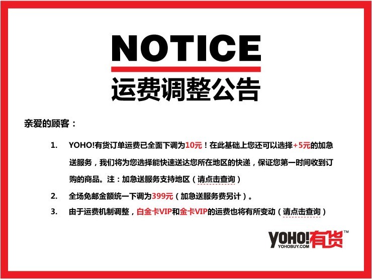 2012年起,YOHO!有貨將原來(lái)每單15元的運(yùn)費(fèi)下調(diào)至10元,購(gòu)物滿(mǎn)一定金額可免郵的門(mén)檻也由原來(lái)的500元下調(diào)至399元。YOHO!有貨物流負(fù)責(zé)人許凱介紹:“在快遞漲聲一片的大環(huán)境下,我們承擔(dān)差價(jià)補(bǔ)貼來(lái)下調(diào)運(yùn)費(fèi),希望降低用戶(hù)潮流網(wǎng)購(gòu)的門(mén)檻。在此基礎(chǔ)上,仍會(huì)保持以往優(yōu)質(zhì)的物流服務(wù),運(yùn)費(fèi)降了,服務(wù)不能降?!贬槍?duì)節(jié)假日的購(gòu)物高峰,YOHO!有貨還推出加急送服務(wù),從訂單審核、物流制單、揀貨包裝、分撿出庫(kù)等各環(huán)節(jié)采取優(yōu)先措施,更大程度上滿(mǎn)足不同用戶(hù)的物流需求。