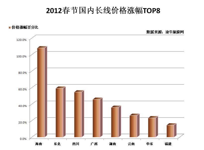 國內(nèi)游方面,華北、海南、四川等熱門方向漲幅也不容小覷,如上海出發(fā)至四川方向的雙飛6日線路,全年平均價格在2500元左右,春節(jié)期間價格在4000元左右;上海至華北方向的春節(jié)價格漲幅也在1000-2000元不等?!敖衲甏汗?jié)上海市民出境游相對明顯,去往海南方向的人數(shù)占比較春節(jié)前倒是略有下降,這與上海市民較為成熟的出游觀念是分不開的,錯峰出游,避開熱門方向的最熱時段,能夠更好地享受旅游目的地的服務(wù)和風(fēng)景,”途牛旅游網(wǎng)工作人員建議市民在選擇旅游目的地時,如有條件盡量避開“人潮洶涌”的過熱方向。