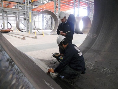 塔架作為風電場關鍵的承載部件,對于風機的安全運行起著重要的作用。相較陸上風電而言,海上風場其條件比較特殊,如鹽霧腐蝕等惡劣的環(huán)境、海上風機的維護不便等,使得確保風機結(jié)構(gòu)及零部件的質(zhì)量與可靠性顯得尤為重要。SGS 此次接受龍源的委托在該項目中提供風機塔筒的第三方監(jiān)造服務,負責生產(chǎn)過程中的質(zhì)量控制和進度控制,深知肩上責任的重要性。SGS 檢驗團隊由2011年8月開始,持續(xù)數(shù)月在江蘇如東塔架制造現(xiàn)場提供一系列的現(xiàn)場檢驗、檢測、審核、監(jiān)督和質(zhì)量控制見證等服務,參照歐洲海上風場風機設備質(zhì)量控制的方案,重點關注塔架材料的理化性能、焊接質(zhì)量、橢圓度及平面度尺寸控制、防腐處理等關鍵項目,從而確保58臺風電機組符合國際質(zhì)量標準。