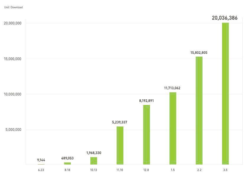 結果是在下載量達到1500萬后僅一個月的時間里再增500萬,自服務開始后8個月內(nèi),累計下載量達到了2000萬次。