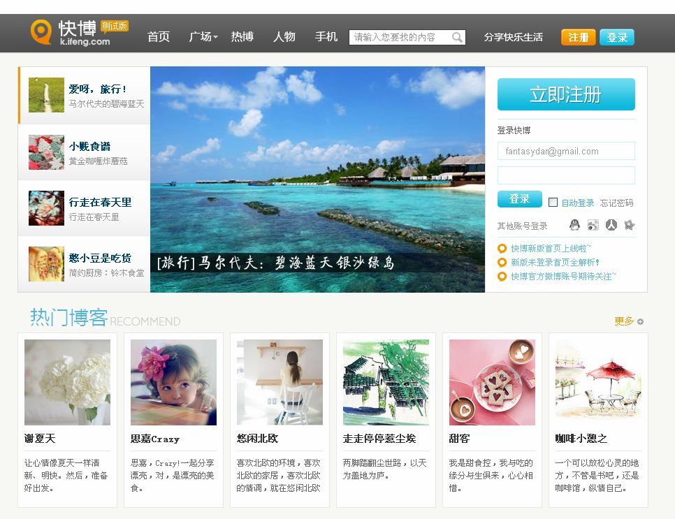 目前,國內(nèi)輕博客市場(chǎng)剛剛起步,作為市場(chǎng)搶先者,鳳凰網(wǎng)早在去年便推出鳳凰快博,試水輕博客運(yùn)營,搶得市場(chǎng)先機(jī)。經(jīng)過近一年的積累,鳳凰快博已經(jīng)形成了旅行、美食、購物等幾大優(yōu)勢(shì)興趣圈組。改版后的鳳凰快博在更加注重內(nèi)容精品化的基礎(chǔ)上,全面提升了用戶體驗(yàn),在分享性和生活化方面均有極大改進(jìn),為用戶獲取信息、表達(dá)態(tài)度提供更大的便利。而此次與騰訊、新浪、開心、人人等幾大強(qiáng)勢(shì)合作伙伴的賬戶貫通,更是簡化了用戶登陸流程,方便了用戶的多平臺(tái)信息共享,為鳳凰快博快速增加用戶提供了保證。