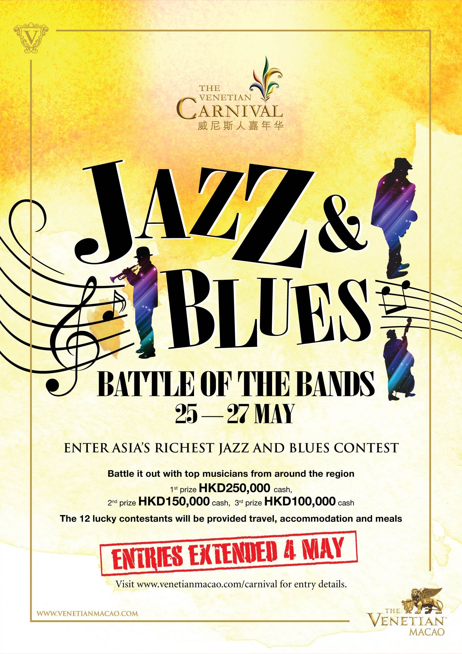 有關(guān)“爵士及藍(lán)調(diào)樂大比拼”的詳細(xì)資料及參賽辦法,請瀏覽 http://www.venetianmacao.com/carnival/,如欲緊貼最新活動消息,請瀏覽www.facebook.com/venetianmacao 或 http://weibo.com/venetianmacao。。