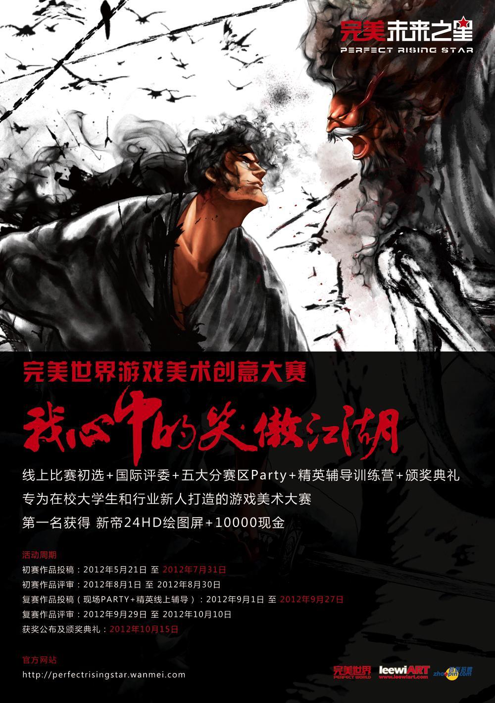 本次比賽是由完美世界主辦,leewiART 國際數(shù)字圖形藝術(shù)推廣機(jī)構(gòu)與智聯(lián)招聘共同承辦的藝術(shù)活動。本次活動面向在校大學(xué)生和剛工作不久的美術(shù)從業(yè)者,希望創(chuàng)作者可以本著開放、自由、創(chuàng)造性的精神,并通過自身對于笑傲江湖文化的理解,創(chuàng)作出屬于自己的江湖世界,作品最終以插畫的形式體現(xiàn),風(fēng)格不限。比賽官方網(wǎng)站(http://perfectrisingstar.wanmei.com),比賽官方新浪微博(http://weibo.com/perfectrisingstar),比賽官方騰訊微博(http://t.qq.com/perfectrisingstar)也將在比賽啟動日同期上線。