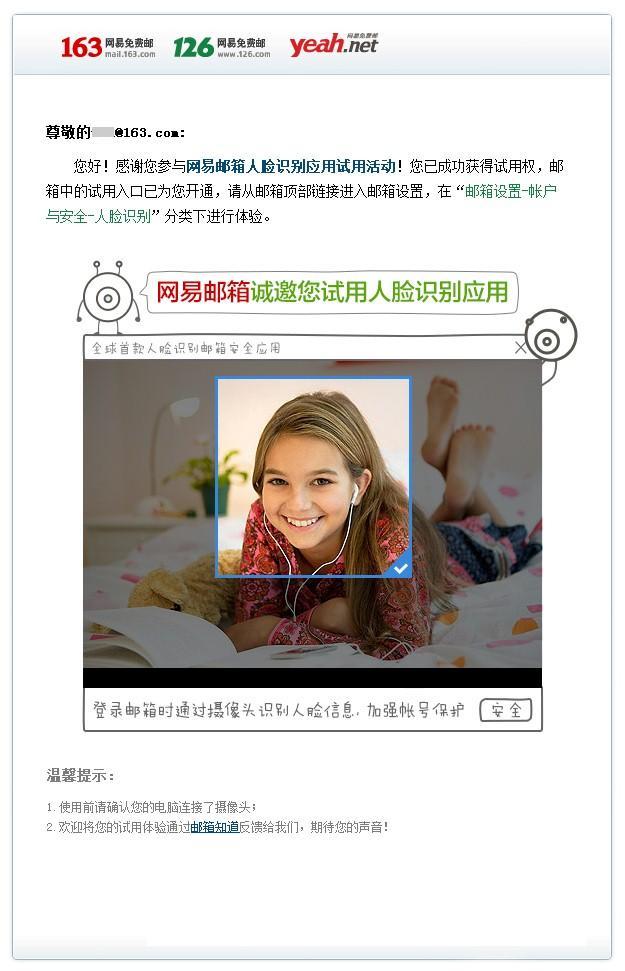 此次,網(wǎng)易人臉識別系統(tǒng)率先與網(wǎng)易旗下用戶量較大的網(wǎng)易郵箱產(chǎn)品進(jìn)行了結(jié)合,網(wǎng)易郵箱介紹,網(wǎng)易郵箱上的網(wǎng)易人臉識別應(yīng)用已經(jīng)通過了內(nèi)部測試,現(xiàn)進(jìn)入公測階段,公開招募郵箱用戶對產(chǎn)品進(jìn)行試用,網(wǎng)易郵箱將根據(jù)反饋結(jié)果進(jìn)一步優(yōu)化產(chǎn)品,為下一步在郵箱所有用戶中全面上線作鋪墊。