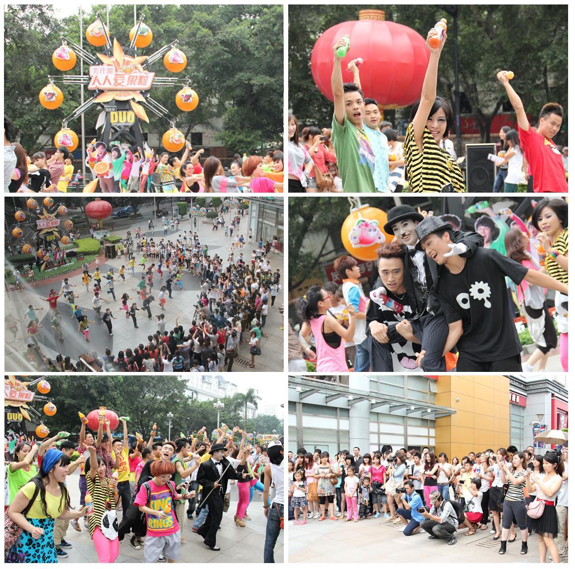 6月2日中午時(shí)分,也就是12點(diǎn)整,在摩天輪前上演了一場(chǎng)極富戲劇性的快閃秀??扉W現(xiàn)場(chǎng)架設(shè)了5個(gè)攝影機(jī)位,35個(gè)舞者在路人毫不知情、毫無(wú)準(zhǔn)備的情況下,一哄而出,集體跳起撼動(dòng)現(xiàn)場(chǎng)的舞步。當(dāng)陳奕迅特意為『美汁源』創(chuàng)作的主題曲《人人愛(ài)》響徹萬(wàn)達(dá)廣場(chǎng)時(shí),這群充滿活力的年輕人用舞蹈完美地詮釋了“人人愛(ài)果?!钡闹黝},將『美汁源』陽(yáng)光、活潑、快樂(lè)的品牌特質(zhì)發(fā)揮得淋漓盡致,舞動(dòng)期間,還為圍觀的行人空拋美汁源果汁,送上了爽口美味的『美汁源』果汁飲料。