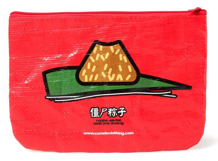 本次僵尸小袋延續(xù)一貫的怪趣風(fēng)格,細(xì)看這位CORPSE,絕對不乏潮味,頭頂?shù)摹?字,大膽作風(fēng)。嘴邊粽粒殘香,吃完還不忘高呼“I LOVE ZONGZI”,可愛至極;而紅與黑早已成為這位“小僵尸”的專屬色,紅的一面象征著活力與熱情配以神秘靜寂的黑,盡顯僵尸本色,有沒有一種HOT的感覺?材質(zhì)上出于功能考慮,依舊選用編織覆膜,防水、耐磨、易清洗。整體而言,不繁復(fù)的設(shè)計(jì)卻也足夠引人側(cè)目 -- 既有僵尸元素,又囊括了傳統(tǒng)的粽子,可謂是混搭潮流的應(yīng)景之作。