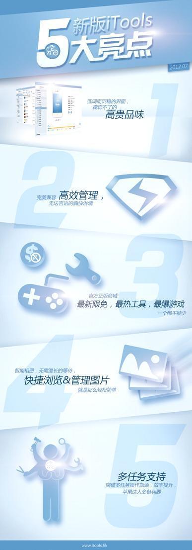 深圳2012年7月26日電 /美通社亞洲/ -- 由創(chuàng)想天空所開(kāi)發(fā)的 iTools 新版于7月25日正式發(fā)布,為移動(dòng)互聯(lián)網(wǎng)行業(yè)注入一劑強(qiáng)心劑。iTools 是一個(gè)蘋果輔助管理軟件。有別于其他類似的軟件,iTools 讓蘋果用戶盡管在沒(méi)有越獄的情況下,也可以非常方便的完成對(duì)蘋果設(shè)備的信息、音樂(lè)、鈴聲、電子書、圖片、桌面、軟件安裝、互聯(lián)網(wǎng)資源下載、系統(tǒng)信息的修改等工作,充分的滿足用戶的各種需求。