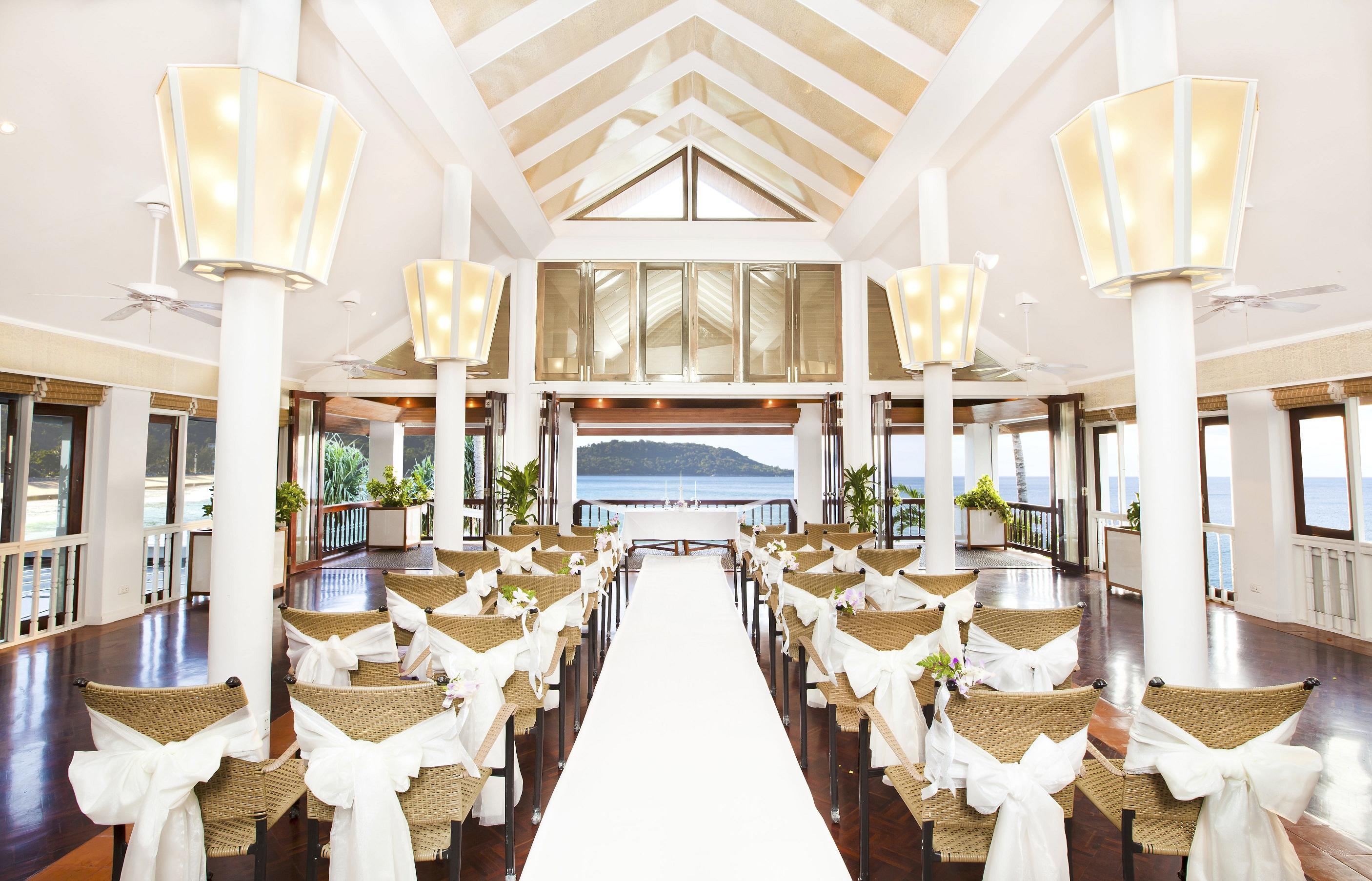 來自泰國水上文化的靈感,獨(dú)具泰式風(fēng)格的拉古娜婚禮堂以柱子支撐,幽靜地漂浮在拉古娜湖畔。禮堂內(nèi)飾夢幻而輕快,潔白的格調(diào)給人莊嚴(yán)的圣潔感。教堂面向西北方,當(dāng)由滑動玻璃構(gòu)成的側(cè)面墻壁打開時,充足的陽光灑進(jìn)室內(nèi),映射出波光粼粼的湖水幻影,營造出一種恍若仙境的感覺。高聳的屋頂,玻璃墻壁,流水背景,繁茂的熱帶花園和咫尺之遙的海灘,都會讓人留下永恒的美麗記憶。