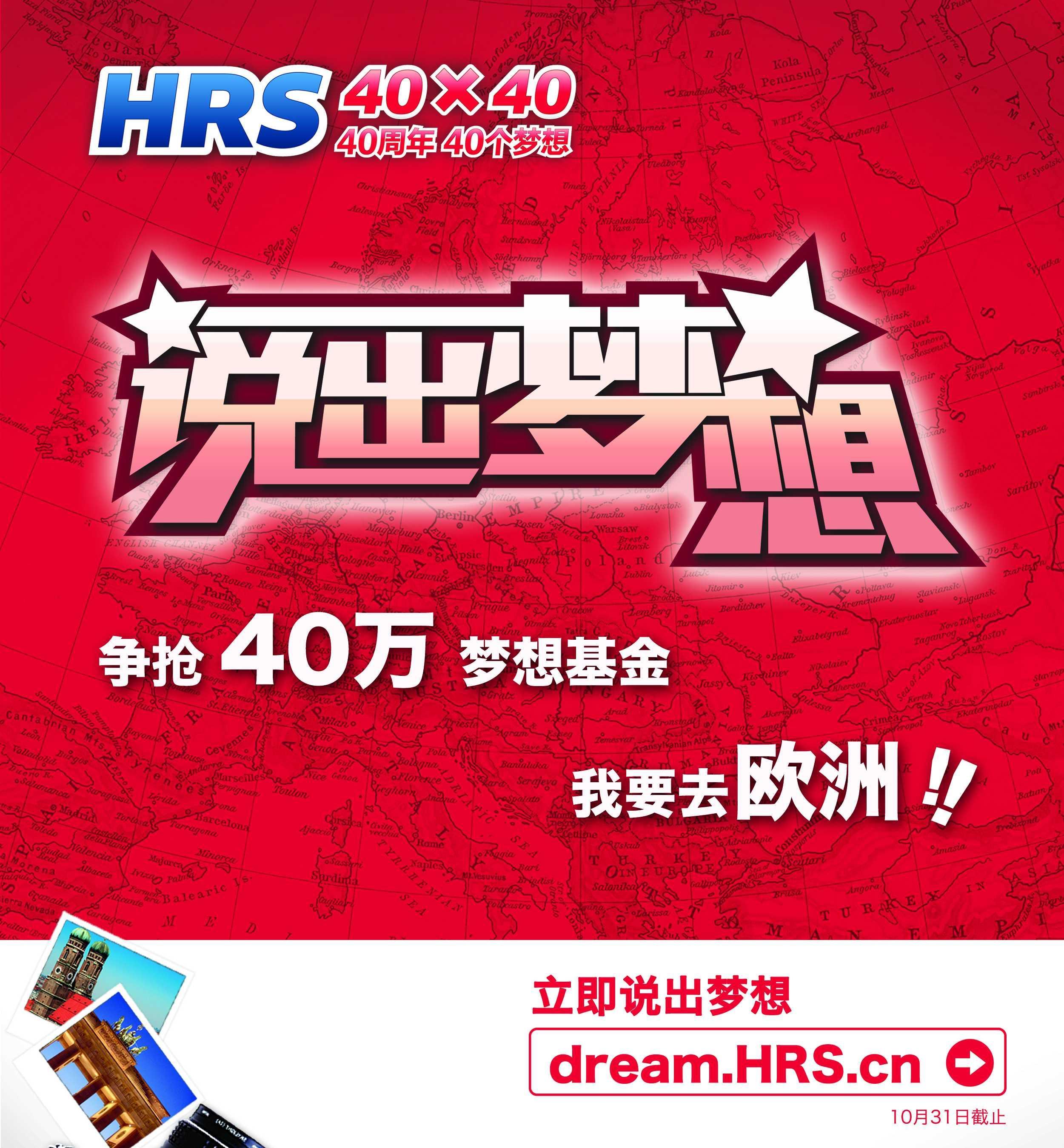 “HRS 40周年 40個(gè)夢(mèng)想”于9月1日正式啟動(dòng)。您可以通過HRS中文官方網(wǎng)站HRS.cn,進(jìn)入“HRS40周年 40個(gè)夢(mèng)想”的活動(dòng)頁面進(jìn)行報(bào)名,寫下您的歐洲夢(mèng)想。通過網(wǎng)上投票,以及HRS和權(quán)威旅游媒體的評(píng)比,其中40名參加者將獲得HRS提供的1萬元的夢(mèng)想基金,以輕松完成歐洲之旅的夢(mèng)想。獲獎(jiǎng)名單將分別于9月底和10月底公布,詳情請(qǐng)登陸http://dream.hrs.cn/。