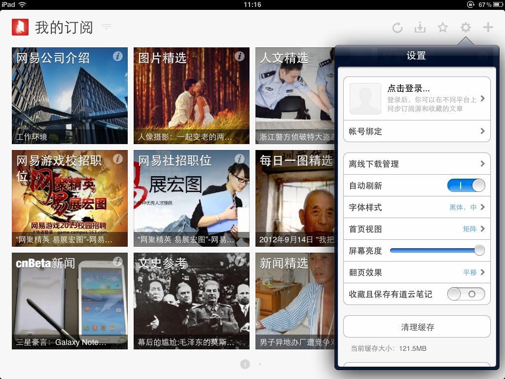 點(diǎn)擊主頁(yè)面右上角的設(shè)置按鈕,可以看到新版網(wǎng)易云閱讀使用了折疊菜單的設(shè)計(jì),使得設(shè)置情況可以在一個(gè)導(dǎo)航條中完整顯示,讓用戶可以一目了然的知曉網(wǎng)易云閱讀的設(shè)置狀況。