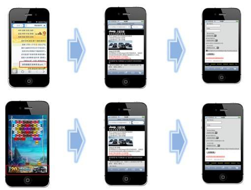 Jeep 以男性為主的受眾人群特性,力美廣告精選新聞、財(cái)經(jīng)、資訊、體育等手機(jī) WAP 及APP媒體,借助力美廣告平臺(tái)優(yōu)勢(shì),采取機(jī)型定向技術(shù),鎖定高端智能機(jī)手機(jī)用戶(hù),精準(zhǔn)覆蓋目標(biāo)受眾。針對(duì) WAP 網(wǎng)站,潛在用戶(hù)可點(diǎn)擊 Banner 后進(jìn)入全屏廣告,并可登陸試駕頁(yè)面,填寫(xiě)相關(guān)信息,申請(qǐng)?jiān)囻{;針對(duì) APP 內(nèi)置廣告,潛在用戶(hù)可點(diǎn)擊 Banner 后直接跳轉(zhuǎn)至活動(dòng)移動(dòng)頁(yè)面。