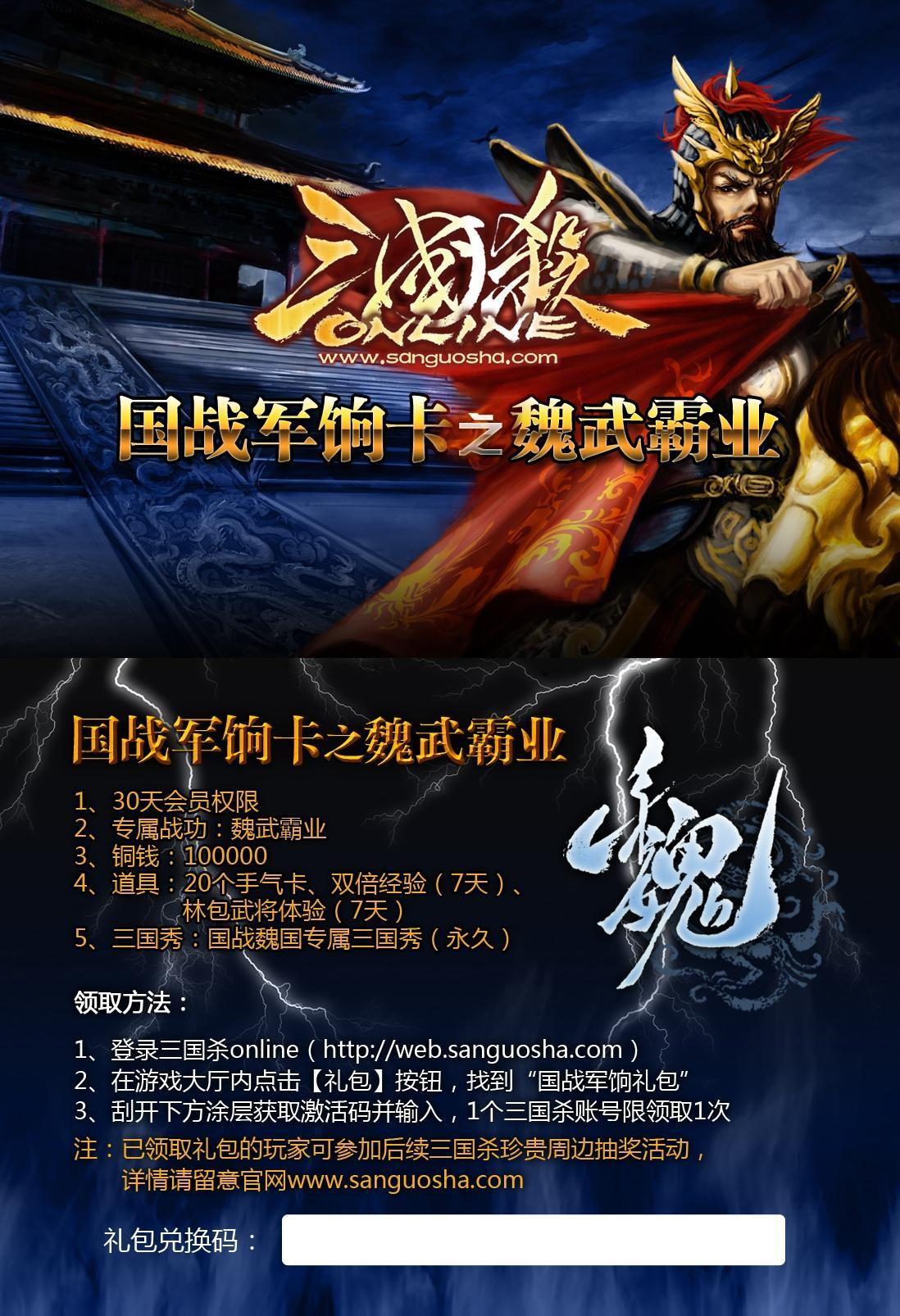 每套《三國殺—國戰(zhàn)》中都有一張國戰(zhàn)軍餉卡,刮開涂層獲取激活碼,登陸《三國殺OL》官網(wǎng)激活后,即可領(lǐng)取“國戰(zhàn)軍餉禮包”,豐厚的線上獎勵助玩家成為《三國殺OL》達(dá)人。禮包包括:30天會員權(quán)限,專屬戰(zhàn)功,100000銅錢,20張手氣卡,雙倍經(jīng)驗(7天),林包武將體驗(7天),永久國戰(zhàn)三國秀。值得一提的是,魏,蜀,吳,群雄四股勢力都有各自不同的專屬戰(zhàn)功和國戰(zhàn)三國秀。