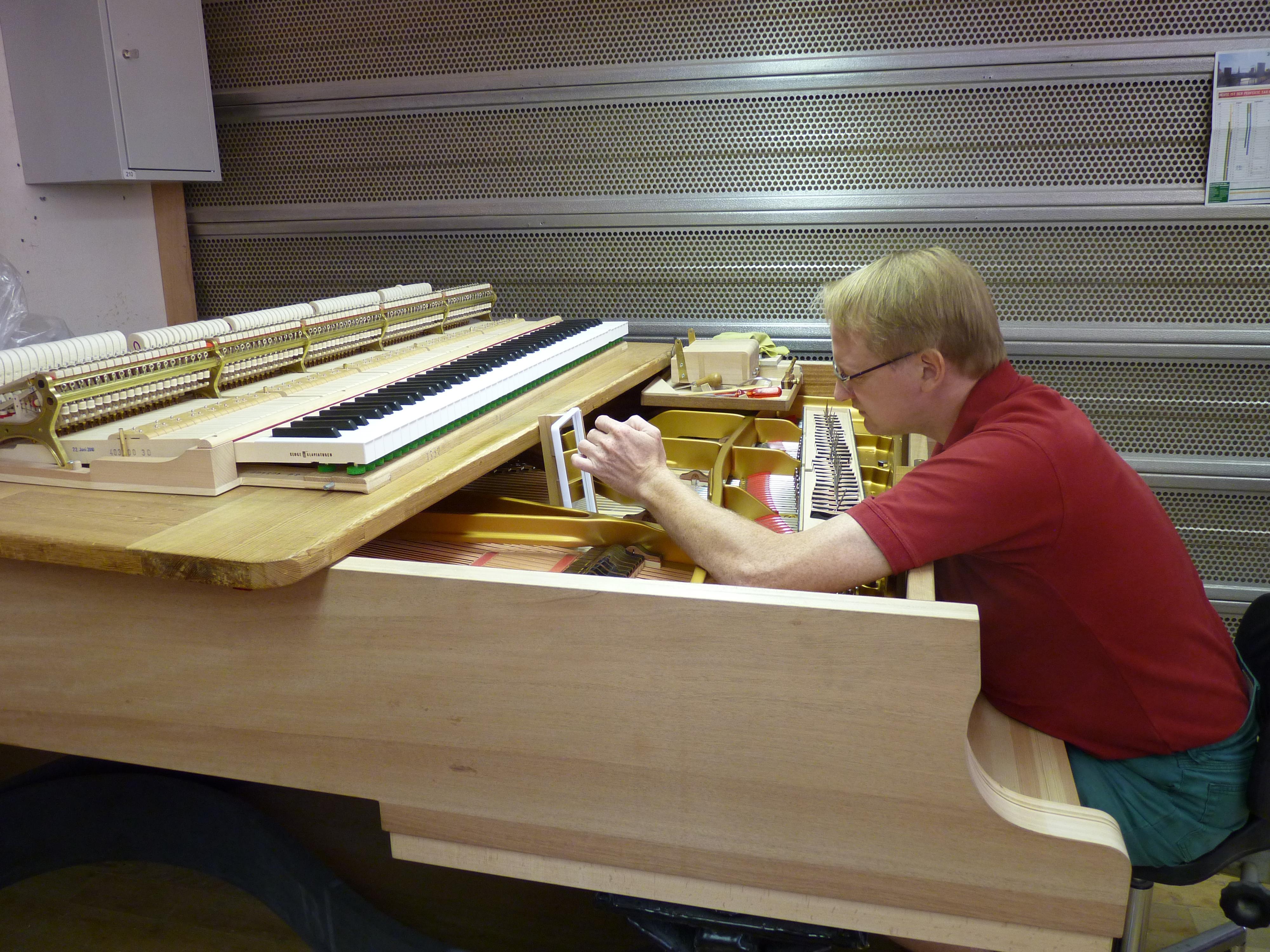 在施坦威工廠,除了讓人嘆為觀止的制琴工藝之外,每一位制琴師專注的神情和一絲不茍的工作態(tài)度也給參觀者留下了深刻的印象。生產(chǎn)鋼琴是一項操作復(fù)雜、漫長刻苦的過程,但制琴師從未流露出絲毫的懈怠,而是全身心投入到每一道工序之中,并對每一個細節(jié)孜孜以求。