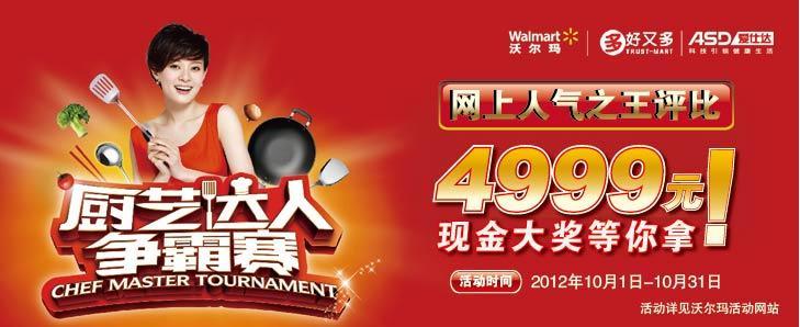 沃爾瑪廚藝達(dá)人爭(zhēng)霸賽的網(wǎng)上人氣之王評(píng)比也正在火熱進(jìn)行中。即日起至10月31日,熱愛(ài)美食、愿意露兩手的沃爾瑪顧客可登陸活動(dòng)網(wǎng)站www.wmhuodong.com,點(diǎn)擊“廚藝達(dá)人爭(zhēng)霸賽”,將菜肴烹制過(guò)程的照片上傳(提交菜式不限數(shù)量),與所有門(mén)店初賽冠軍的比賽作品一起接受網(wǎng)友投票,參與網(wǎng)上人氣之王評(píng)比。獲得最多投票的選手將獲得一等獎(jiǎng),贏得4999元現(xiàn)金;3名二等獎(jiǎng)達(dá)人將獲得1000元沃爾瑪購(gòu)物卡;6名三等獎(jiǎng)達(dá)人將獲得200元沃爾瑪購(gòu)物卡(詳情以店內(nèi)及網(wǎng)絡(luò)公告為準(zhǔn),請(qǐng)咨詢門(mén)店服務(wù)臺(tái))。